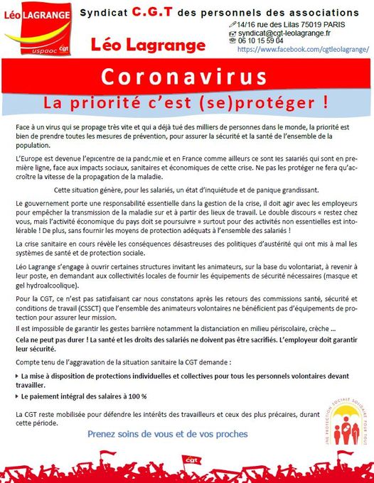 Animation, Communiqués, Formation, Petite enfancePar CGT Léo Lagrange29 mars 2020